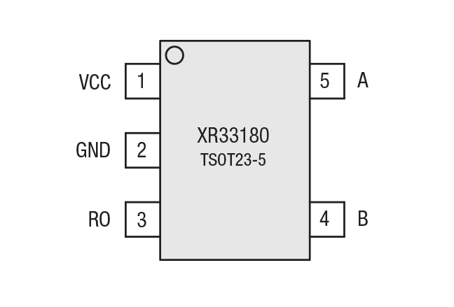 The XR3318x offers several pinout options to maximize performance in different applications while maintaining a minimum pin count. The XR33180 is available in a 5-pin TSOT23 package with the receiver always enabled. The XR33181 is available in a 6-pin TSOT23 package and offers an active high receiver enable pin while the XR33183 has the same pinout but with active low enable pin. The XR33184 is available in a 6-pin TSOT23 package with an I/O logic supply pin to ease the interface to MCU’s or FPGA’s that run off of different supply voltages. The VL supply pin allows the XR33184 to interface to other devices running off of supplies from ranging from 1.65V to VCC.